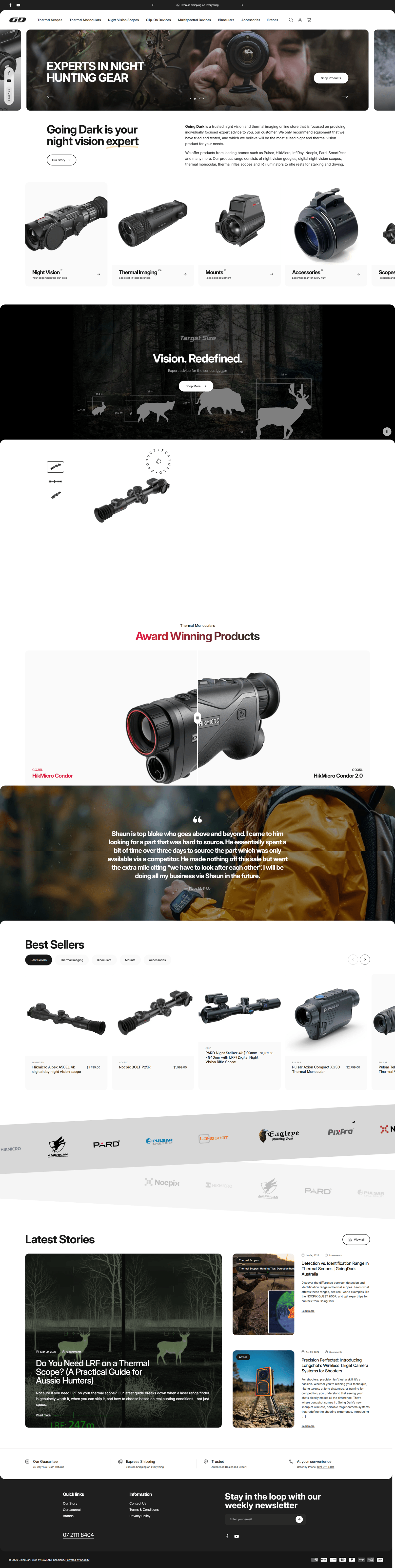 Most thermal and night vision sites push product first and trust second. GoingDark's homepage flips that — making the curated, expert-led approach visible before the catalogue. Visitors get a sense of why they should buy here, not just what's for sale.